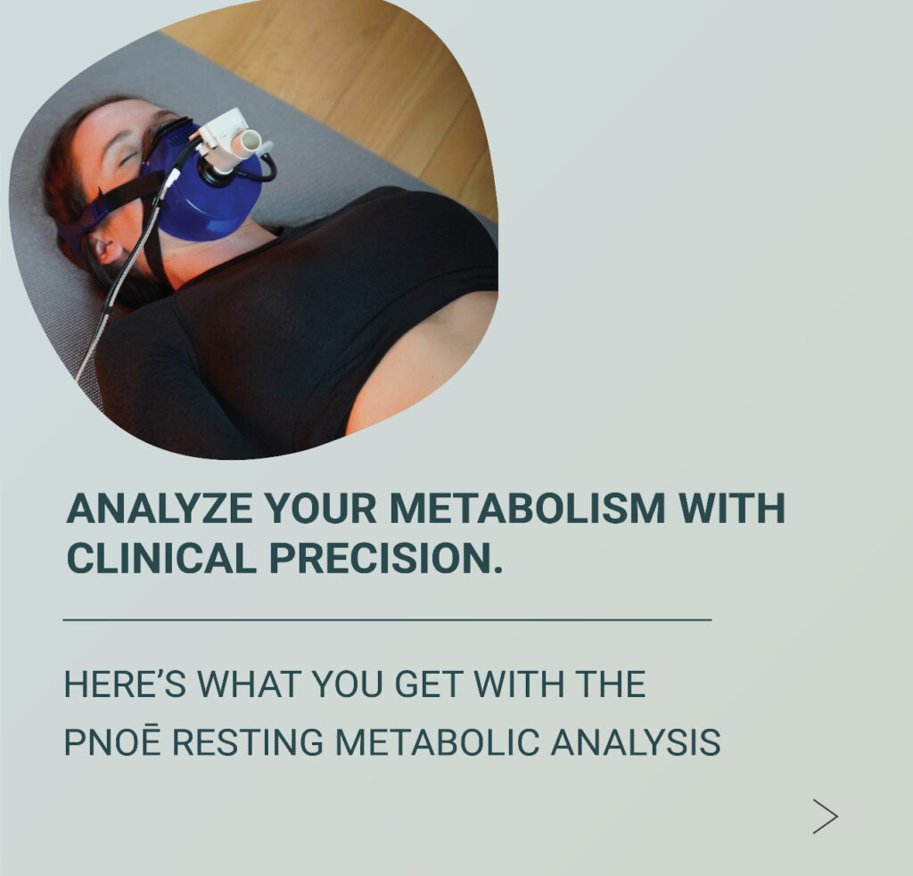 You breathe into a comfortable mask connected to the Metriq by PNOĒ system. The device analyzes your breath in real time to measure key metabolic markers such as: